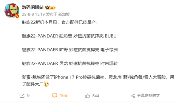 该博主还透露,魅族也为iPhone 17 Pro做了妙磁抗菌壳,颜色有灵龙、旷野、独角兽、雪人大冒险。
